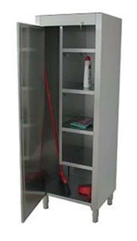 L'armoire produits d'entretien en acier inoxydable est disponible avec une ou deux portes, selon sa taille. Elle est conçue avec un espace de rangement pour les balais d'un côté et, de l'autre, trois étagères réglables ainsi qu'une étagère fixe, ce qui en fait un meuble à la fois pratique et robuste. Équipée de portes battantes fermant à clé, cette armoire est un élément essentiel pour votre cuisine professionnelle, vous permettant de maintenir un environnement propre et organisé.