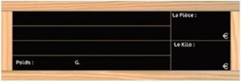 Etiquettes ardoise "Prix du pain". Avec cadre en bois, elles mettent en valeur vos produits tout en facilitant l’affichage des prix. Grâce à leur surface neutre et personnalisable, vous pouvez écrire vos informations à la craie ou au feutre blanc, et les modifier facilement selon vos besoins. L’inscription "La pièce / Le kilo / Le poids" vous permet d’indiquer clairement les tarifs. Vendues par lot de 24.