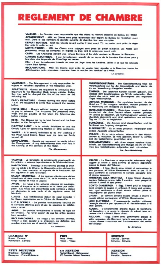 PANCARTE 180x295 mm – Règlement chambres en 5 langues