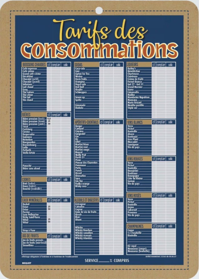 TARIFS CONSOMMATIONS 500x700 mm Be Kraft, carton alvéolé 10 mm