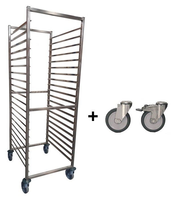 • 4 roues pivotantes chape inox (dont 2 avec freins)